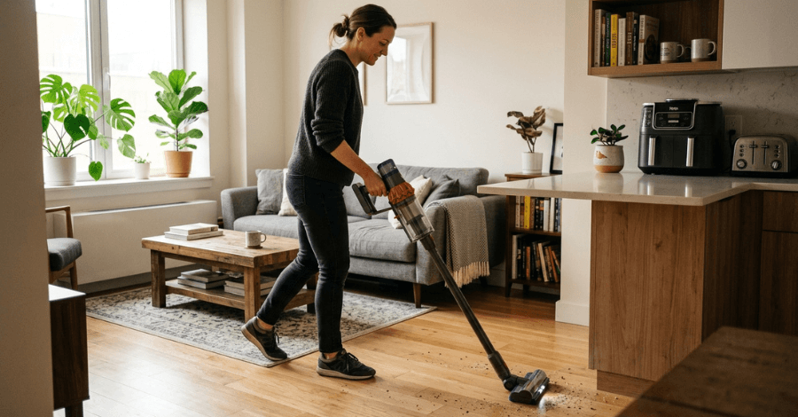 - Ferramentas de limpeza rápida: O aspirador vertical e o mop substituem a vassoura com vantagem, permitindo que você limpe o chão em minutos sem precisar de baldes pesados.
